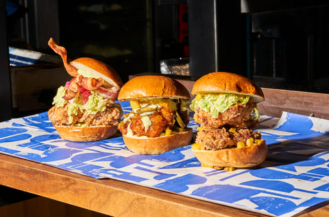 Karaage fried chicken, smoked daikon pickles and napa cabbage slaw on a milk bread bun